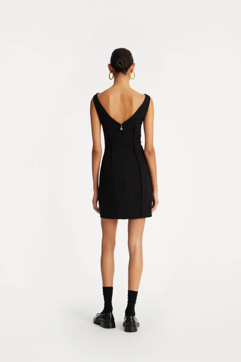 Crepe Off Shoulder Dress Black features a streamlined silhouette with a concealed back zipper. The hemline falls to a mini-length and maintains a structured finish.