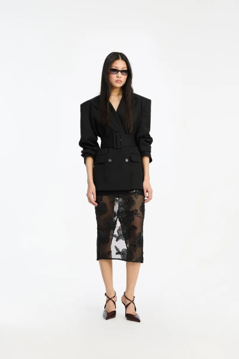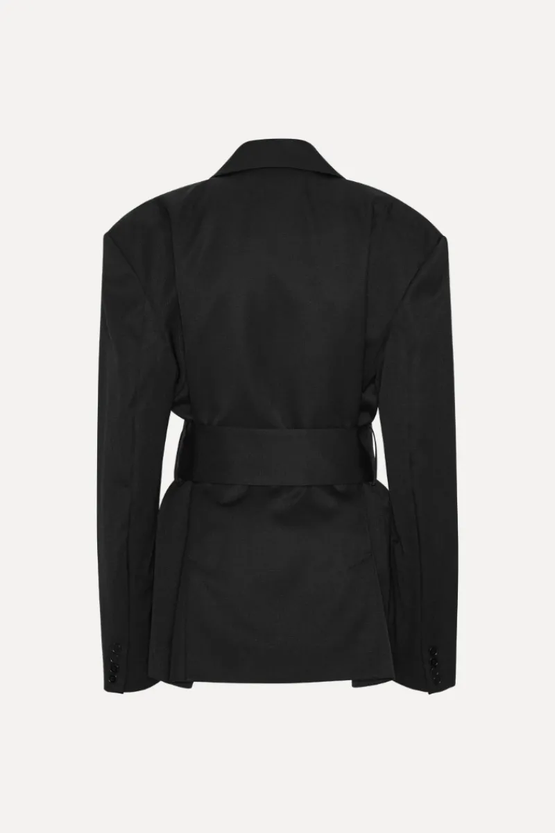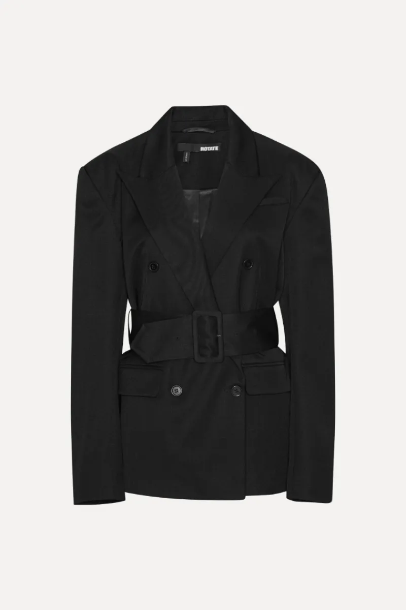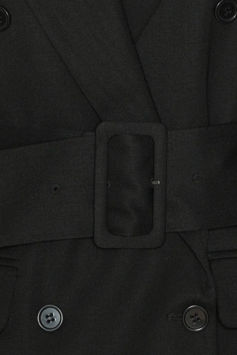 Belted Blazer Black is a double-breasted blazer. The design features sharp shoulders and a wide belt that accentuates the waist. The blazer has front flap pockets and buttoned cuffs. The blazer is lined.
