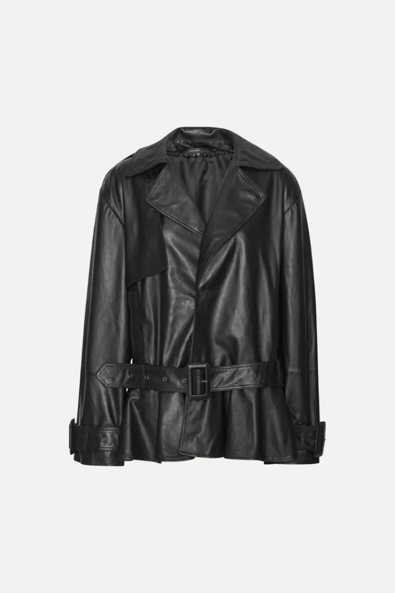 Biker Leather Jacket Black is crafted from smooth lamb leather and features a structured collar, front button closure, and a detachable belt. The hem is gathered in a peplum shape, adding volume to the silhouette. The jacket has lining.