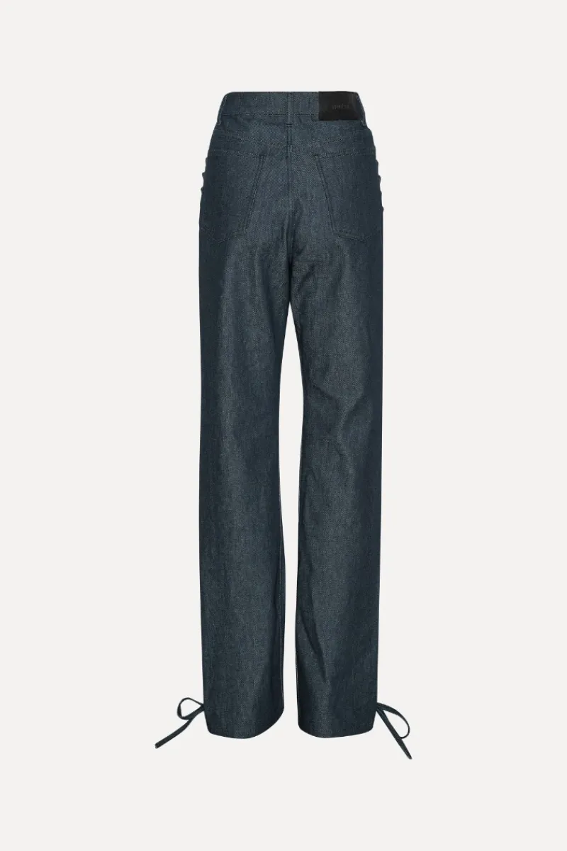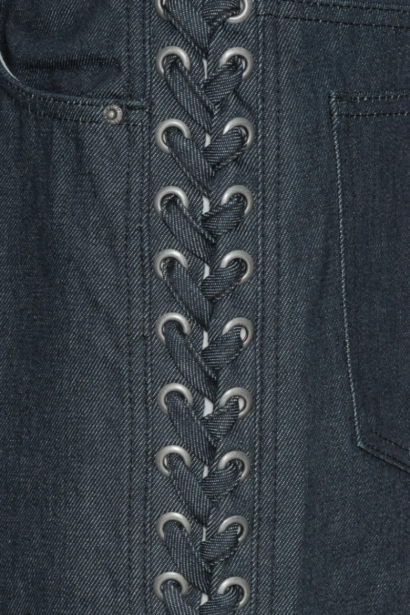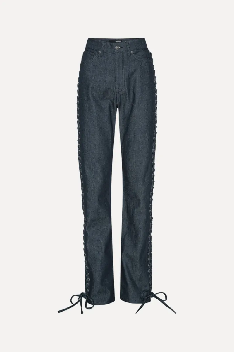 Laced Straight Leg Jeans Dark Blue are made from dark blue denim with lace-up details along both legs. They feature straight legs and tie fastenings at the ankles. The jeans are made from 100% organic cotton.