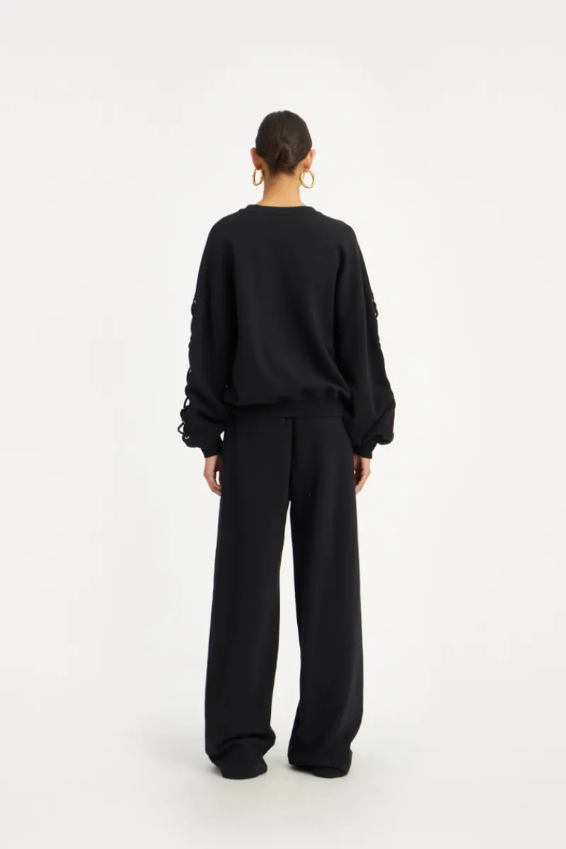 The Lacing Sweatpants feature a high-rise fit with lace-up detailing running down the front of both legs. Designed with an elasticated waistband and cuffed hems, these pants bring a bold, structured element to soft jersey comfort.