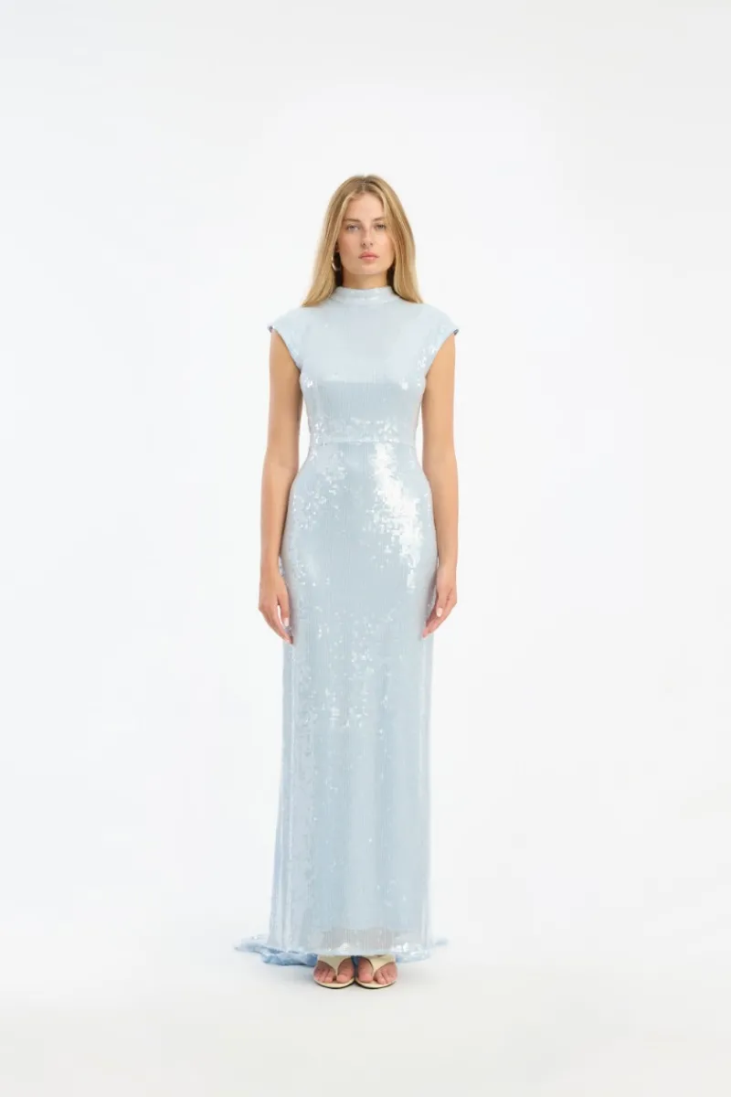Sequins Cap Sleeve Dress Light Blue is a floor-length dress with a fitted silhouette and short cap sleeves. It features a high neckline and a subtle waist seam that defines the shape. The dress is covered in fine sequins, creating a softly shimmering surface. It is finished with a center back zipper closure and a light train at the hem. The dress is lined and crafted from a recycled polyester blend with stretch.