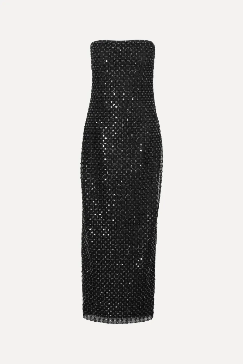 Beaded Maxi Tube Dress Black is a strapless ankle-length dress with a fitted silhouette. It features an all-over square-patterned sequin surface. The design includes a secure grip inside the top edge, a back slit for movement, and a zip closure at the back. The dress is lined.