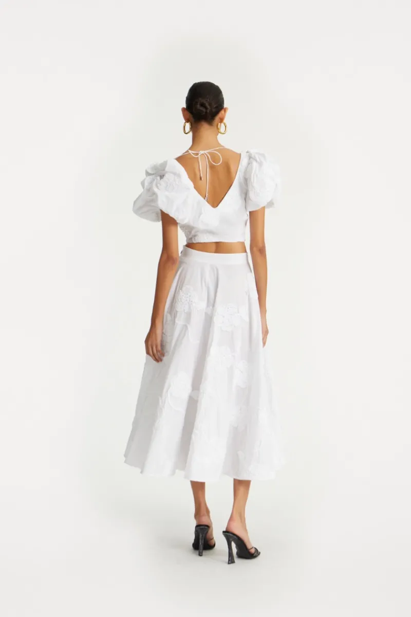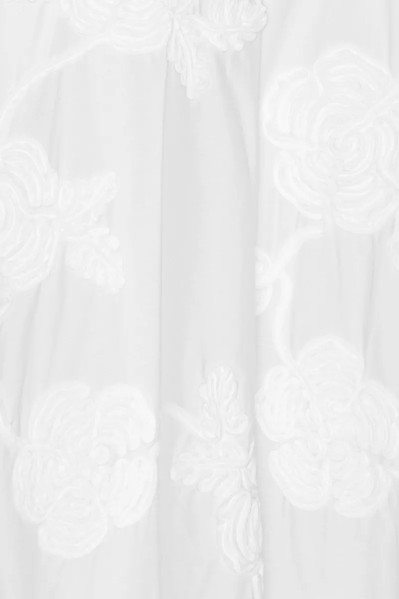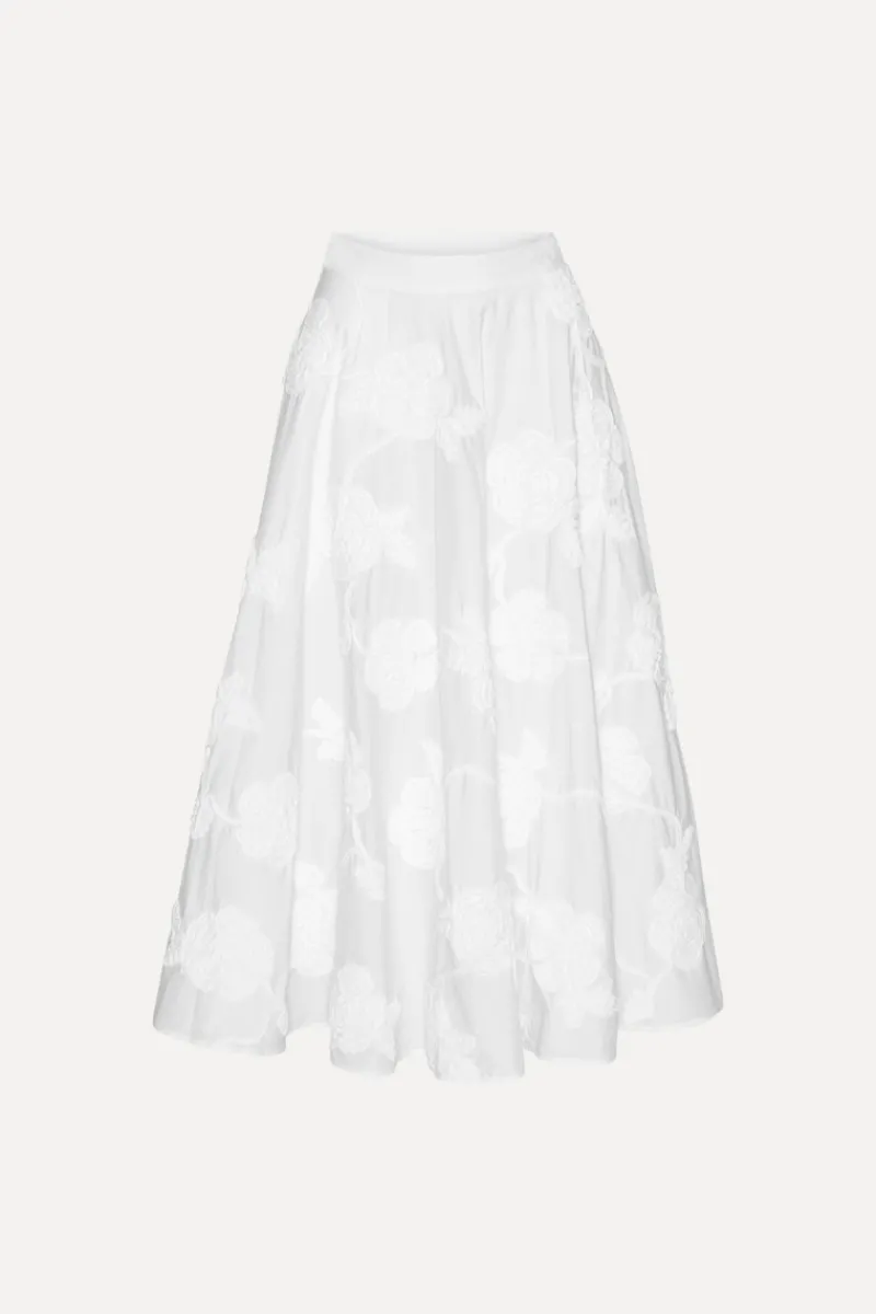 Flower Maxi Skirt Bright White is a high-waisted skirt with a voluminous, flared silhouette. It features an all-over tonal floral embroidery and is softly gathered at the waistband. The skirt is finished with a concealed side zipper.