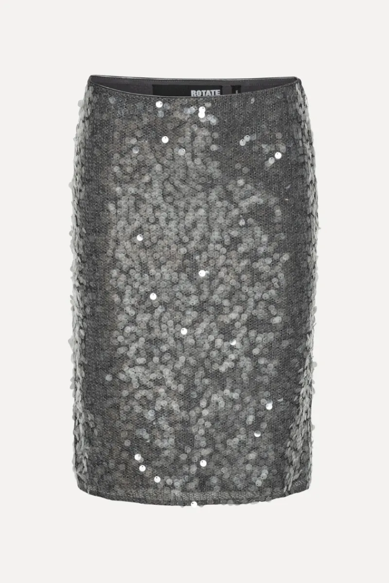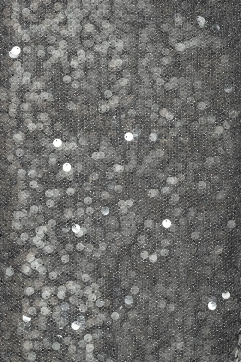 Net Sequin Midi Skirt Dark Grey features a high-waisted silhouette with a straight cut. A concealed back zipper ensures a secure fit, while the hemline maintains a clean edge.