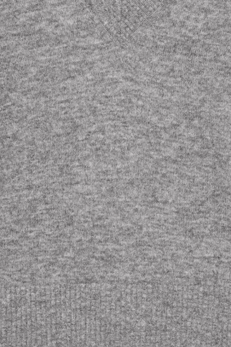 DBU x ROTATE Knit V-neck Sweater Grey is a soft knitted sweater in a light gray tone. The design features a V-shaped neckline, long sleeves, and ribbed edges at the neckline, cuffs, and hem. A small ROTATE logo is placed on the chest, adding a subtle branded detail. The sweater is unlined and made in a wool and cashmere blend.